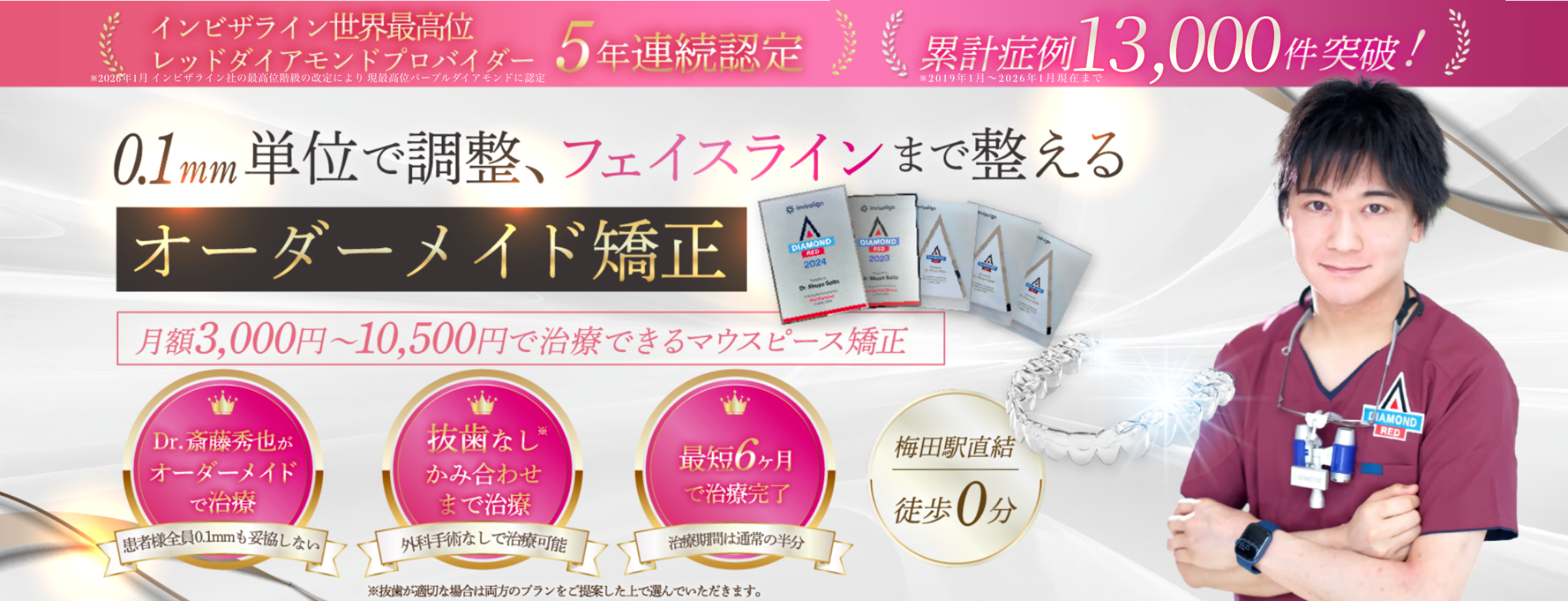 こんにちは。「大阪梅田さいとう矯正歯科」院長の斎藤 秀也(さいとう しゅうや)です。当院はマウスピース型装置、「インビザライン」を用いた矯正治療を行っています。