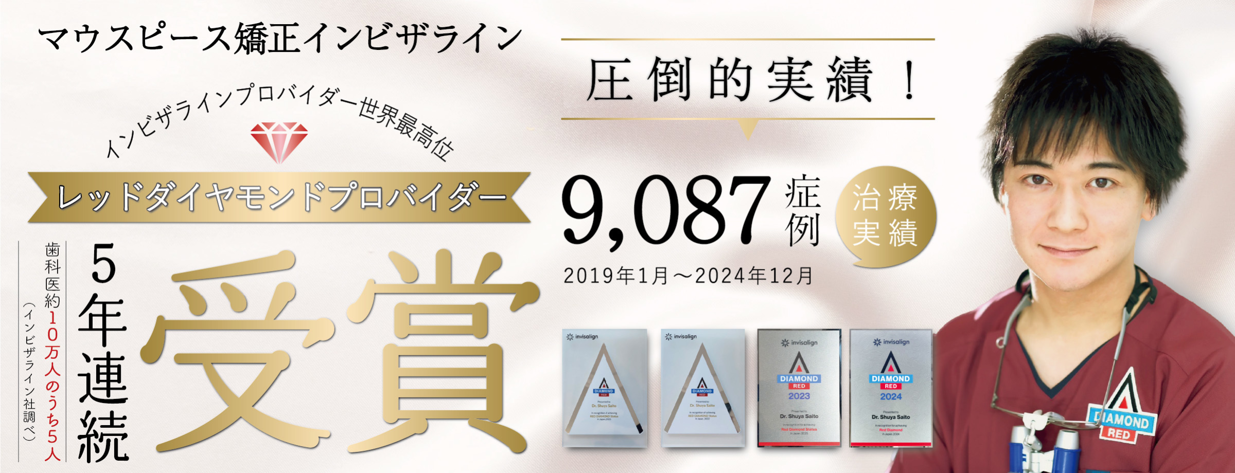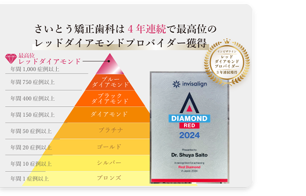 はい、可能です。インビザライン矯正は担当する歯科医師の経験により、対応できる内容が大きく変わります。私どもの歯科医院では、「インビザライン・レッドダイヤモンドプロバイダー(2019~2024年連続認定)」のDr.斎藤秀也が治療を担当。豊富な実績に基づき、幅広い症例にマウスピース矯正で対応しています。