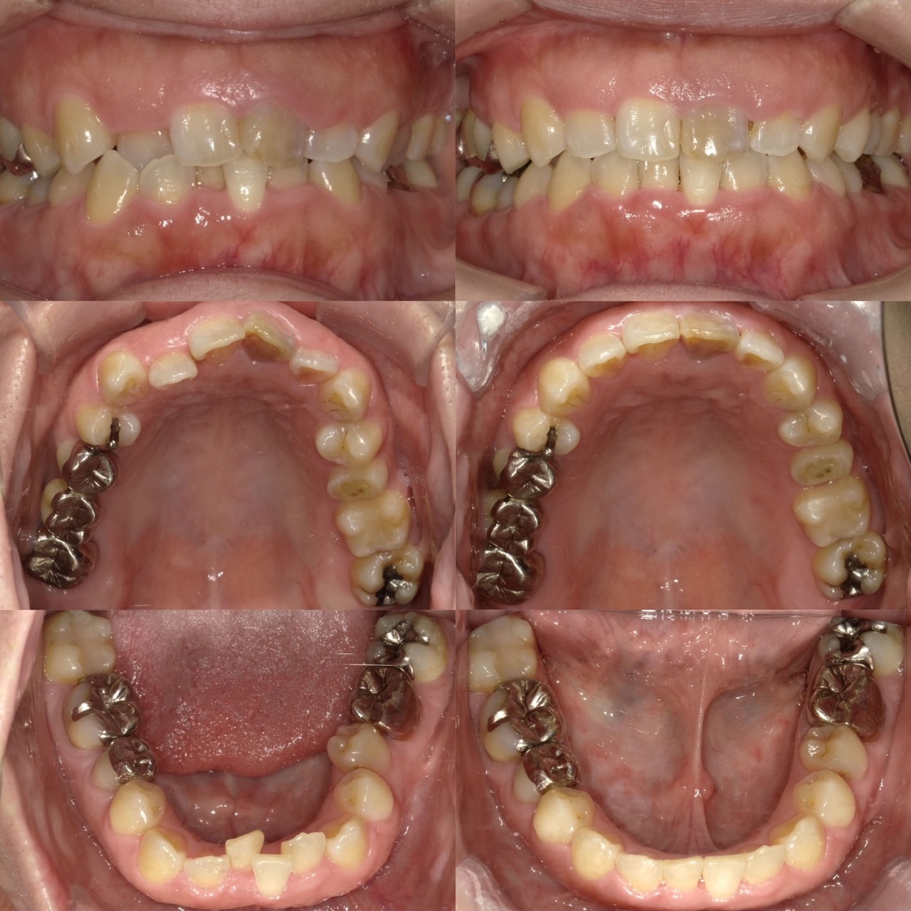 上下のガタガタが大きく、特に下あごは通常なら抜歯が必要なケースでしたが、精密な診断と綿密な計画により、非抜歯で短期間のうちに改善しました。