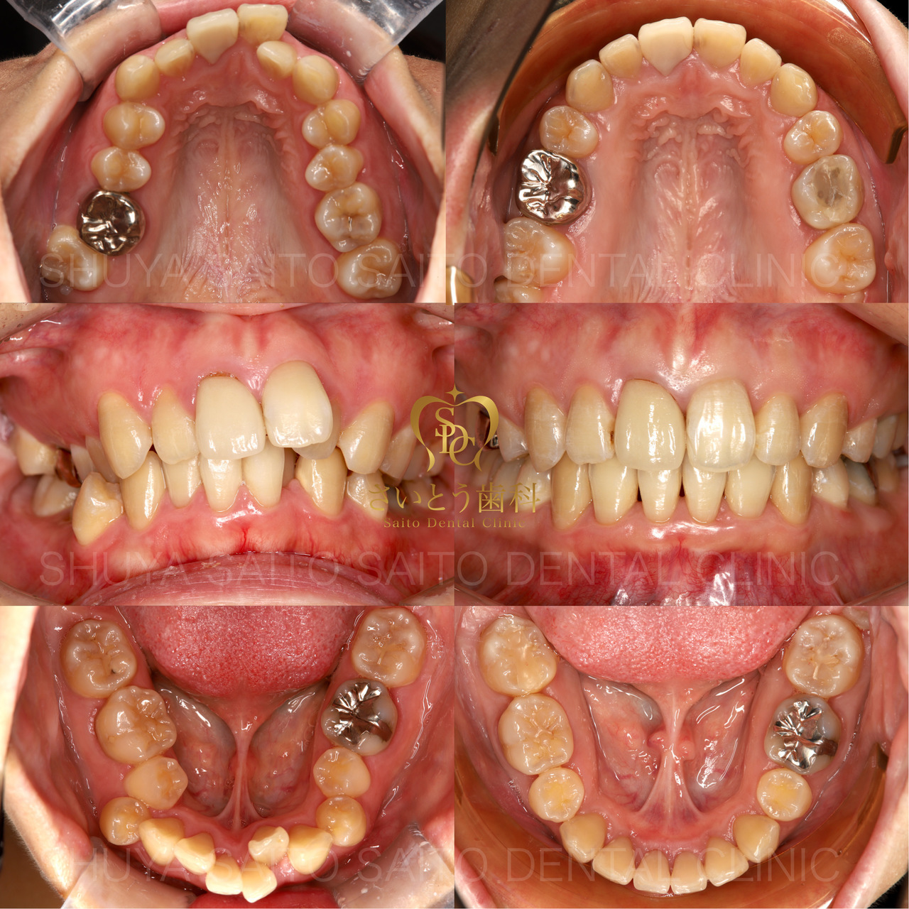 その後、ガミースマイル(笑うと歯茎が露出する状態)の改善のため前歯の歯肉切除を行い、神経をとった歯や銀歯は白い被せ物に交換。