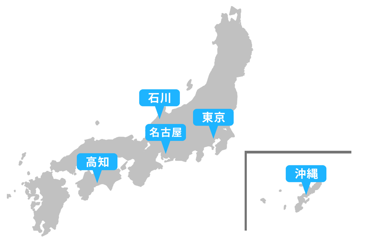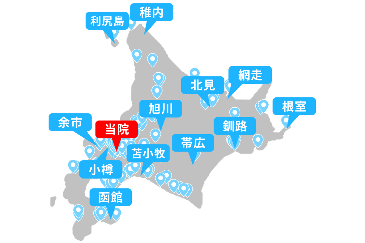 私どもの本院は札幌市内にありますが、北海道各地から患者さまが来院されています。また、新千歳空港を利用すれば、国内の主要都市からも飛行機でアクセスが可能です。そのため、「半年に1度の通院なら」と、以下のような遠方からも、多くの患者さまにご来院いただいています。
